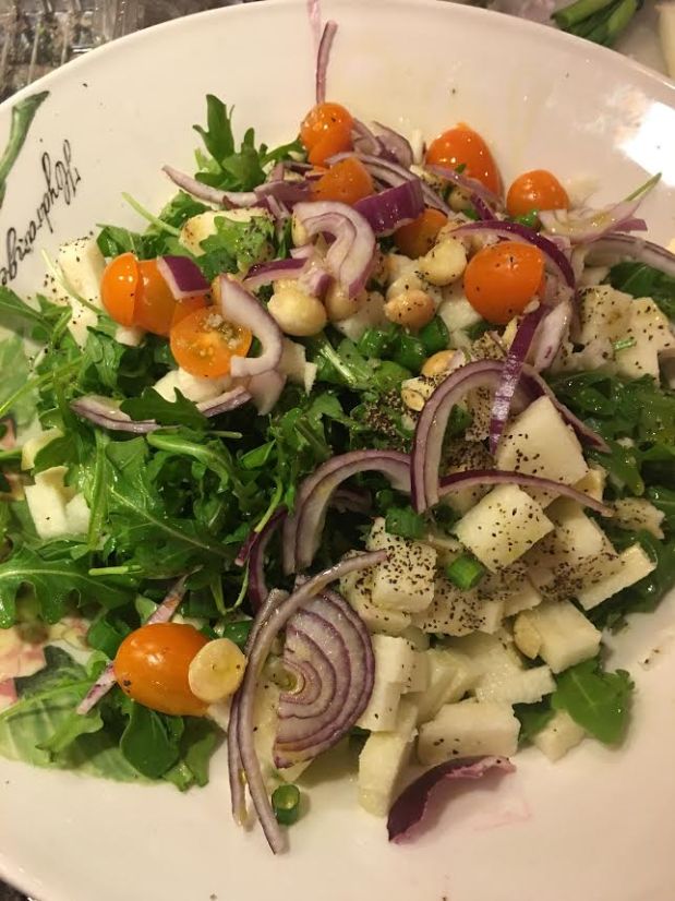 This recipe will wow your taste buds and your eyes with the peppery flavor of arugula, the crunch of jicama, the rainbow colors of baby heirloom tomatoes, the spiciness of the red onions and scallions, and the salty nuttiness of macadamia nuts.