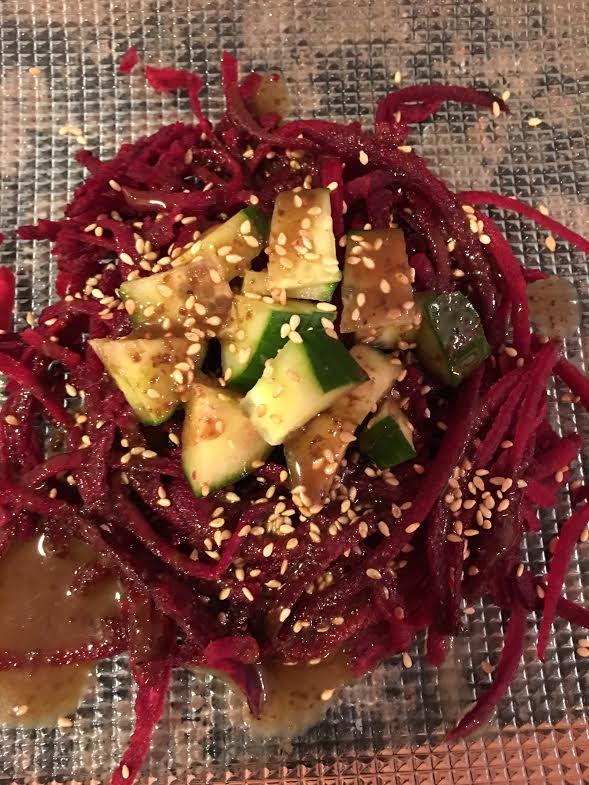 Leah put together some shredded fresh beets, cubed cucumbers and toasted sesame seeds and mixed in some balsamic vinegar dressing. The result was this beautiful and delicious beet salad.