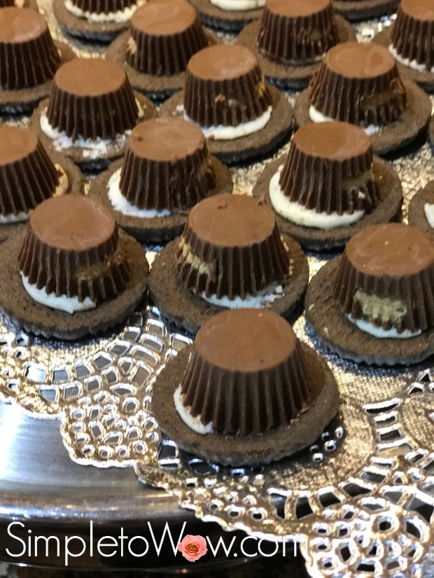Unwrap all the peanut butter cups, removing the outer foil wrap and the paper wrapper around the chocolate. Carefully separate the sandwich cookies, taking care to leave some cream o both cookies.