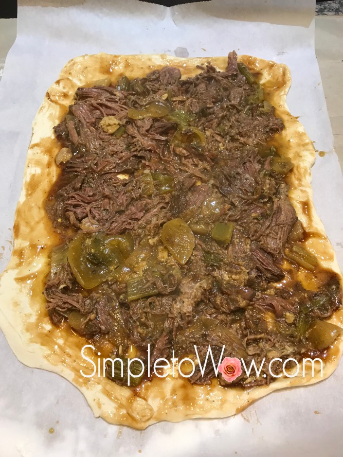 pulled beef babka spread over dough