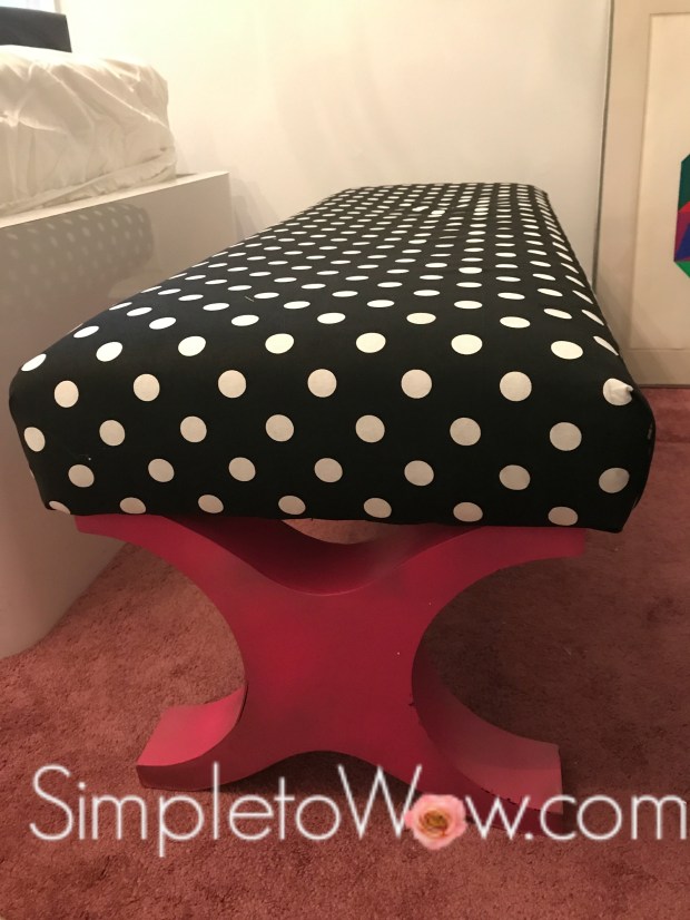 The bench had been a torn nailhead vinyl covered bench with x-shaped legs that I had picked up from a local curb several years ago.  I had been using it as a luggage rack in the guest bedroom.  And, it was the perfect start for Davida’s Kate Spade inspired room.